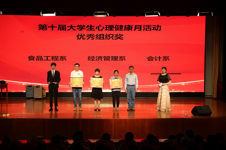 现场还举行了颁奖活动,与往年不同的是,今年将胶东红色文化知识竞赛颁奖仪式也合并到了此次颁奖活动中来,学校领导依次为素质拓展训练营获奖团队、原创剧本大赛、朋辈心理知识竞赛、胶东红色文化知识竞赛、心理健康月优秀组织奖和校园情景剧大赛获奖系部及学生颁奖。