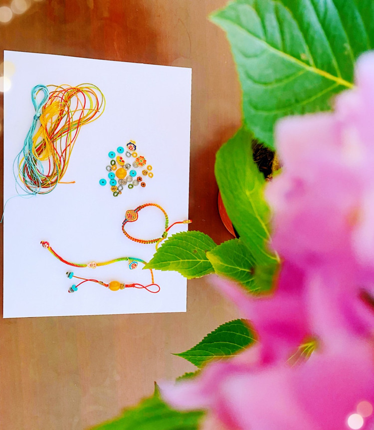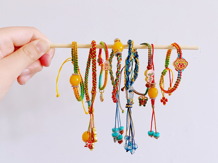 思政部为学生们提前准备好精致的五彩绳编结材料包,通过为学生们示范平安结、金刚结等传统的编结方法,同学们学习后,利用课余时间查找相关视频资料,运用材料包中的五彩线和配饰,创作出更多造型精美的五彩绳作品。
