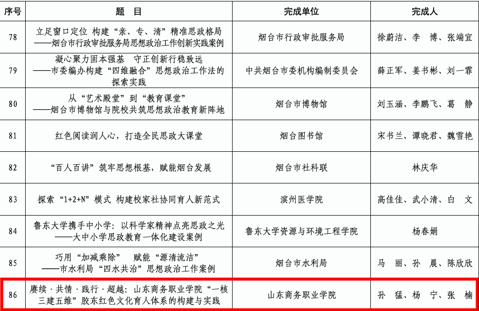 近日,中共烟台市委宣传部公布了2024年度烟台市思想政治工作优秀案例入选名单。我校报送的案例《赓续·共情·践行·超越:山东商务职业学院“一核三建五维”胶东红色文化育人体系的构建与实践》成功入选。