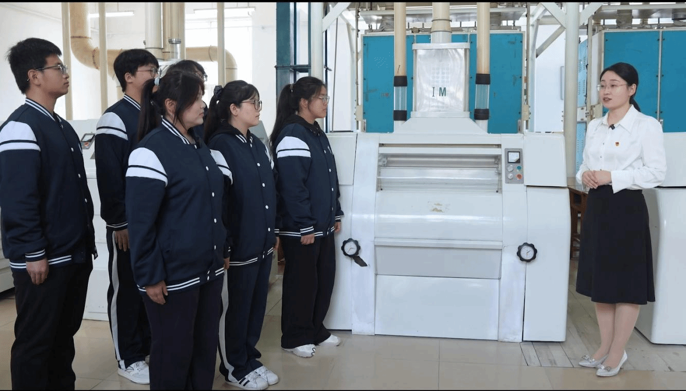 在制粉车间,姜老师以面粉加工为切入点,结合2025年我国粮食生产成就数据,深入剖析耕地减少、种业技术短板、进口依存度高等现实挑战,引导学生全面认知国家粮食安全“家底”,强化居安思危意识和风险防范自觉。