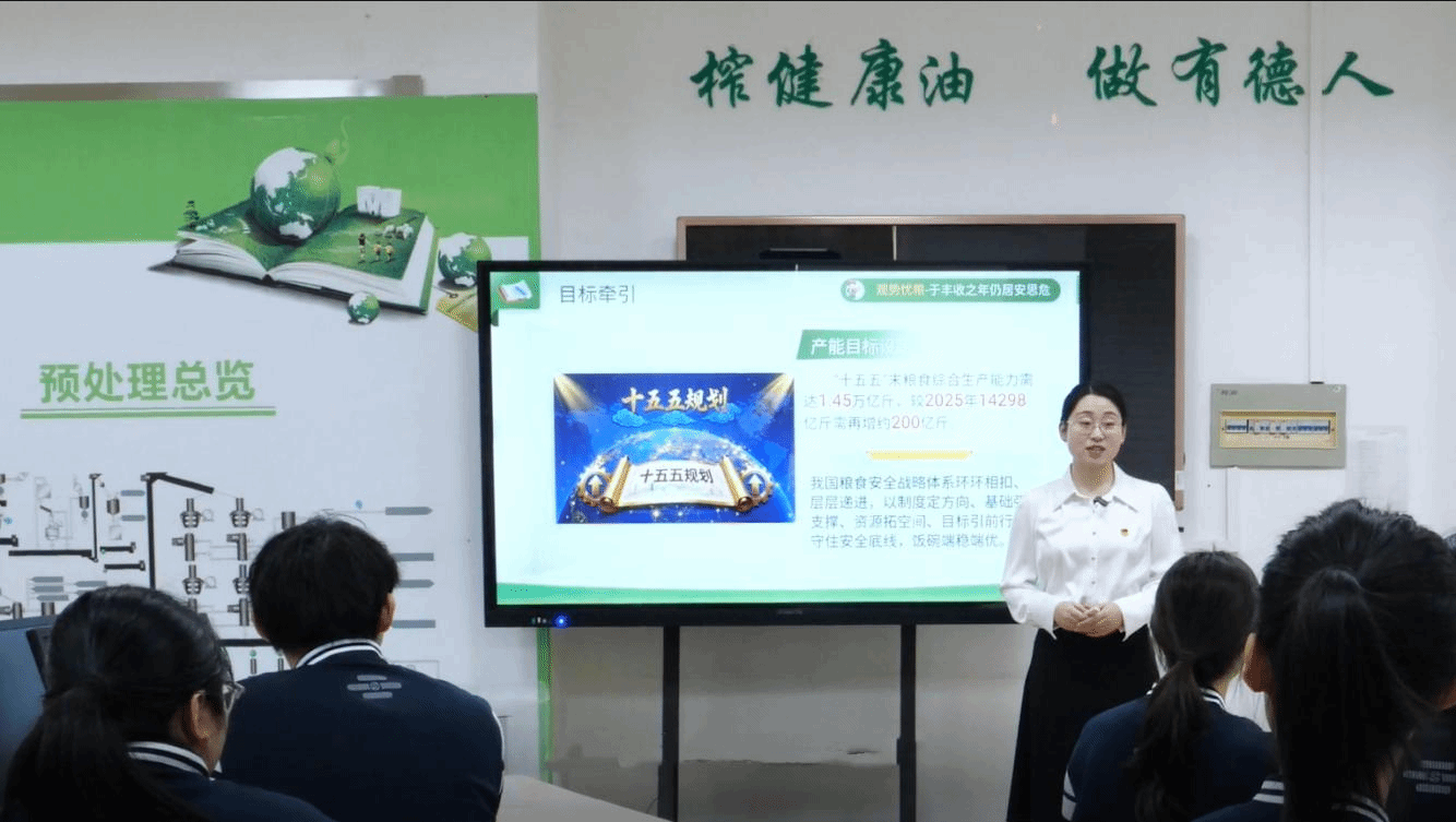 公开课伊始,姜雪晶老师手持大豆种子和食用油,在油脂车间中引导学生观察“从种子到食用油”的完整加工流程,系统讲解粮食安全的四大支柱,强调粮食安全是“国之大者”。