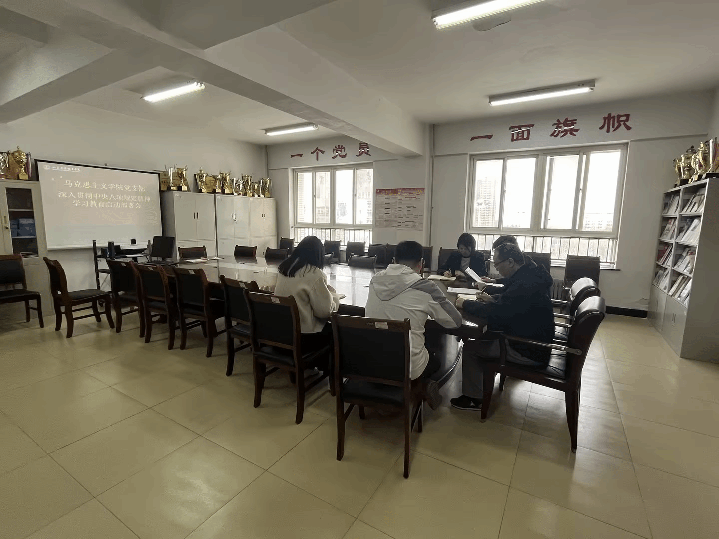 2025年3月25日上午8:30,马克思主义学院党支部召开3月支委会,孙芹宝、姜强、李霖、秦佳丽、于晓芸参会。