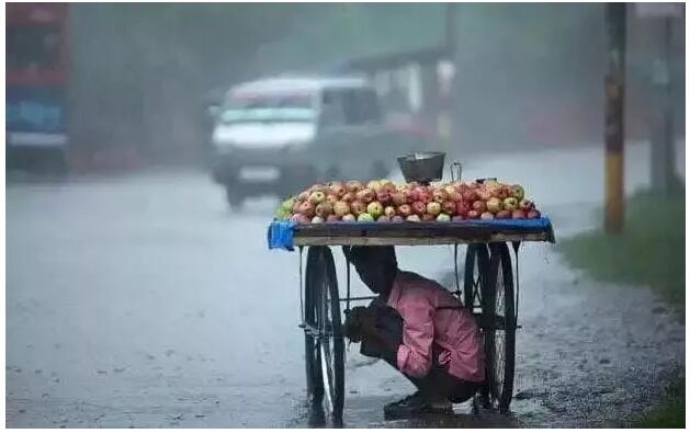 暴雨突如其来,卖水果的小贩无处躲避,只能蜷缩在小推车底下,蒙蒙的雨雾下,形单影只的他显得那么寂寥。